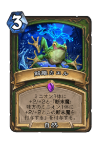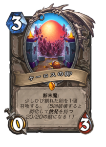 またこのデッキでは上にも書きましたが、解離カエルの効果が、なぜか他のミニオンがいない状態で、ケーロスの卵がわれた場合にも発動するので(一回は破壊されてないといけないみたいですが)、簡単な条件で何度も効果を発動出来きます。だから本来能力を活かすために何枚もカードを入れないといけないケーロスの卵を少ないスロットで活かすことが出来るようになっています。