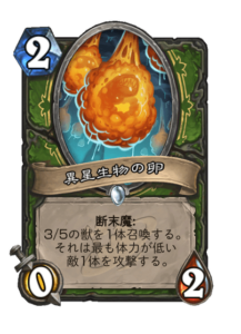 コンボを揃えるデッキには仕方ない話ですが、盤面が弱くなりがちです。このデッキでは、ウィスプ、異星生物の卵、追跡者等の軽くて、盤面が形成しやすいカードである程度補える予定です(予定だから、正直アグロとかは厳しいけど)