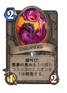 (ハースを知らない人が見ているかもしれないので説明すると、このデッキでは終盤には卵がわれてふかして、このカードを沢山特殊召喚出来るうえに、その前の卵も解離カエルというカードで永続強化されるので、相手は除去しきれなくなります。最大ライフ30ポイントのゲームです)