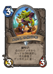 だからサーチカードを増やすことと、またこれは難しい選択ですが他の勝ちすじをいれること、この二点でこれを行いました。また旅行客はデッキの上から3枚を指定できるので、これも引かないための効果という側面があります。