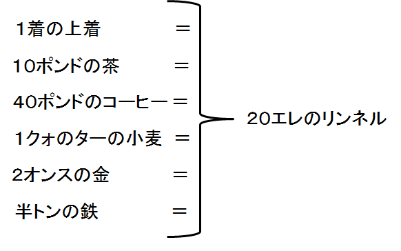 これは、ある一国、または世界において、一般的な貨幣が生成した状態の、商品の関係(価値の関係)を表す。