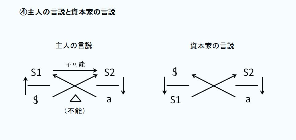 他者の領域S2はシニフィアンの集合であり、そこから、ある一つのシニフィアンが排除される。それが主人のシニフィアンである。主人のシニフィアンS1は、S2の流動的な領域をある程度の範囲で固定する。言語の効果の主体はこのとき生じる。